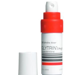 Glytrin 0,4 mg/dosis mundhulespray kan anvendes til hurtig behandling og forebyggelse af hjertesmerter.Glytrin er en sublingual (under tungen) spray, som indeholder det aktive lægemidelstof, glyceryltrinitrat. Glyceryltrinitrat hører til gruppen af medici (Læs mere)